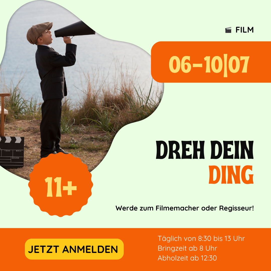 Im Camp „Dreh dein Ding“ wirst du zum Filmemacher oder zur Filmemacherin! Gemeinsam mit anderen entwickelst du deine eigene Story, schreibst Drehbuchszenen und probierst dich als Schauspieler:in, Regisseur:in oder Kameraprofi aus.