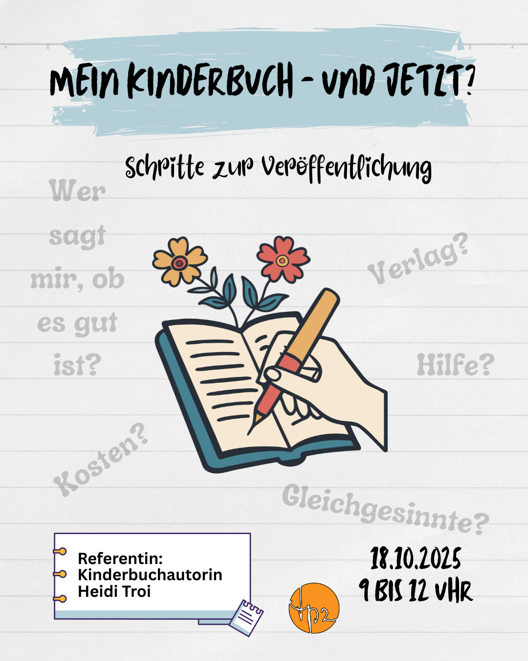 In diesem Workshop nimmt Kinderbuchautorin Heidi Troi die Teilnehmenden mit auf ihren Weg vom ersten Manuskript bis zur Veröffentlichung. Offen und praxisnah teilt sie ihre Erfahrungen, gibt Einblicke in Chancen und Stolpersteine und beantwortet die wichtigsten Fragen: